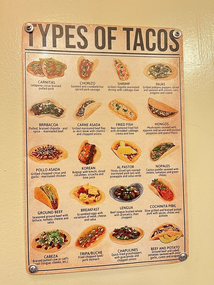 One taco with a grilled crispy corn tortilla wrapped in a soft corn tortilla. With a fried egg, Jack cheese, pinto beans, pico de gallo, & guacamole
