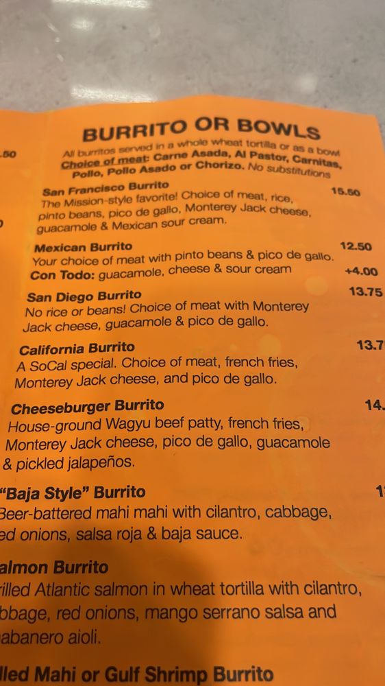 The Mission-style favorite! Choice of meat, rice, beans, pico de gallo, Jack cheese, guacamole, & Mexican sour cream